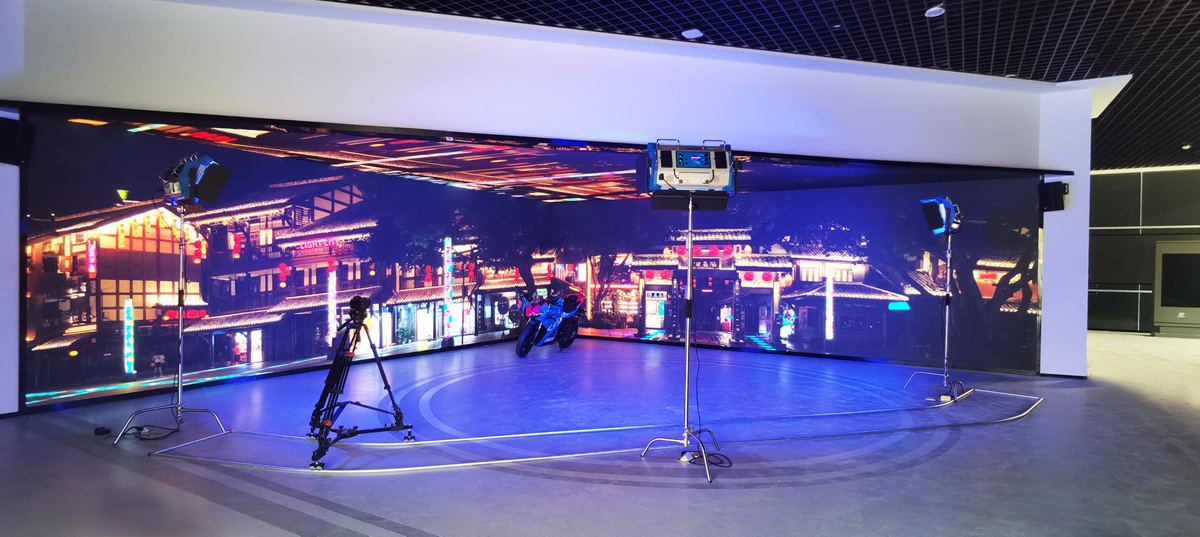 虚拟影棚对屏幕的要求和普通展示不一样。背景场景要逼真,人物与背景的边缘要自然,不能有明显的割裂感。Q1.8 Pro的小间距特性在这类场景里比较实用——像素密度高,近距离观看没有颗粒感,摄像机推上去也看不见像素点。超高的刷新率保证了动态画面流畅,人物移动时背景不拖影,边缘不闪烁。