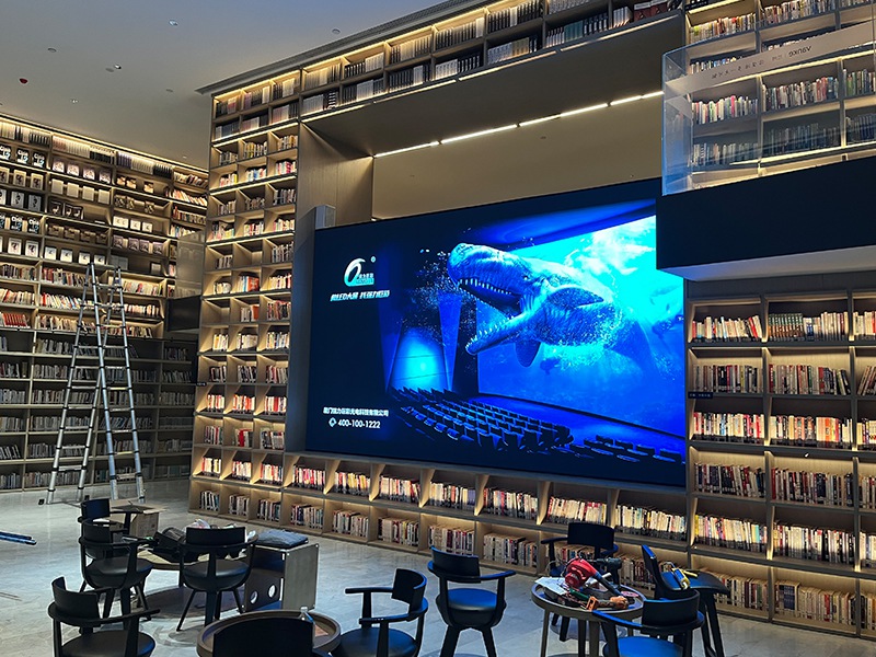 展厅主要是展示图书馆的馆藏特色和各类文化活动预告,以前用的是展板和电视机拼接。展板做一次用很久,内容更新不了;电视机拼在一起,中间有黑缝,看着不连贯。