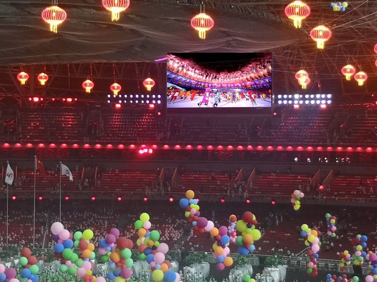 大型体育赛事有一个常见问题:场馆大、看台远、观众多。坐在后排的观众看赛场,细节很难捕捉,比分信息看不清,开闭幕式的视觉效果也打了折扣。这块屏的位置经过专门规划,挂在场馆显眼处,全场各个区域的观众都能清楚看到屏幕内容。
