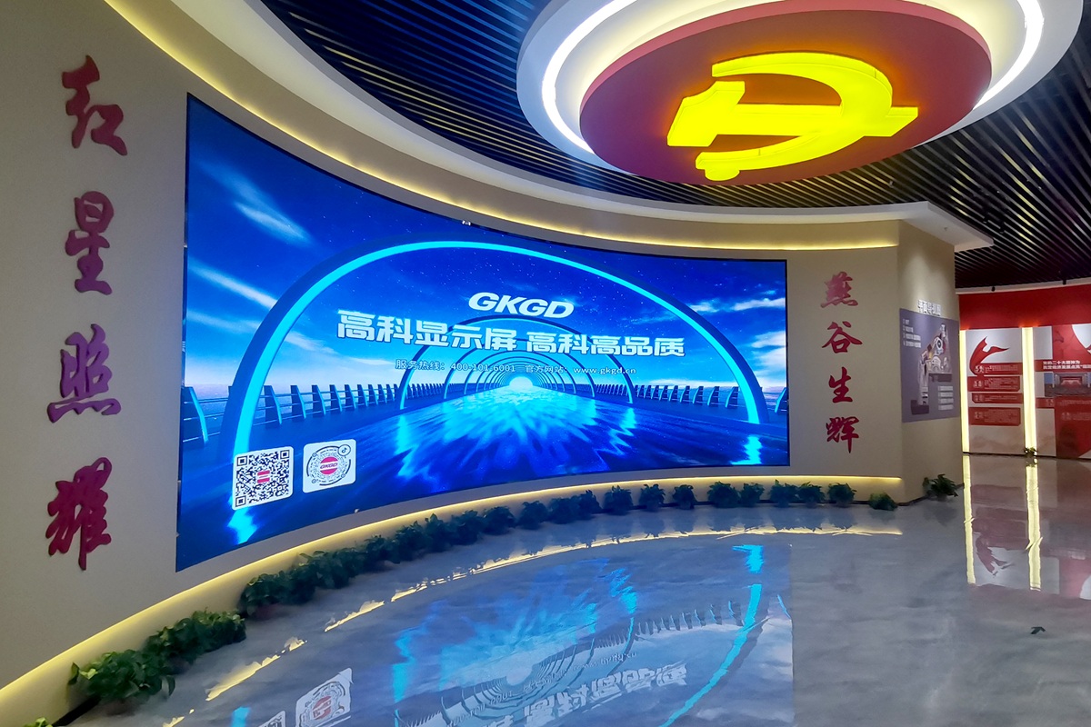 高科光电室内 PH1.86 小间距 LED 显示屏,采用常规表贴工艺,画质细腻、显示均匀、色彩逼真。以弧形造型安装于内蒙古燕谷坊总部二楼序厅,显示效果清晰稳定,整体美观大气,完美适配企业展厅高端展示需求。