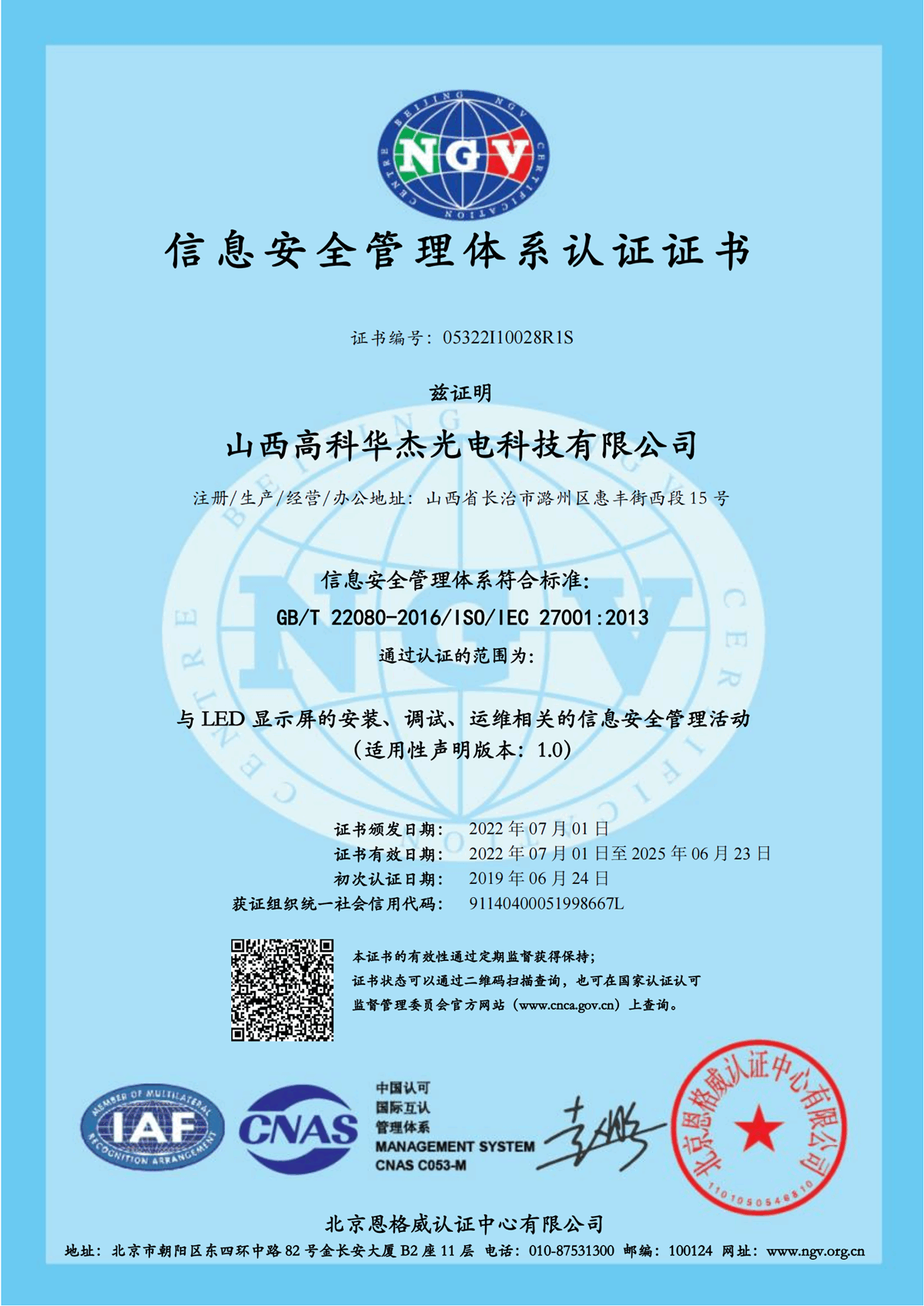 信息安全管理体系证书