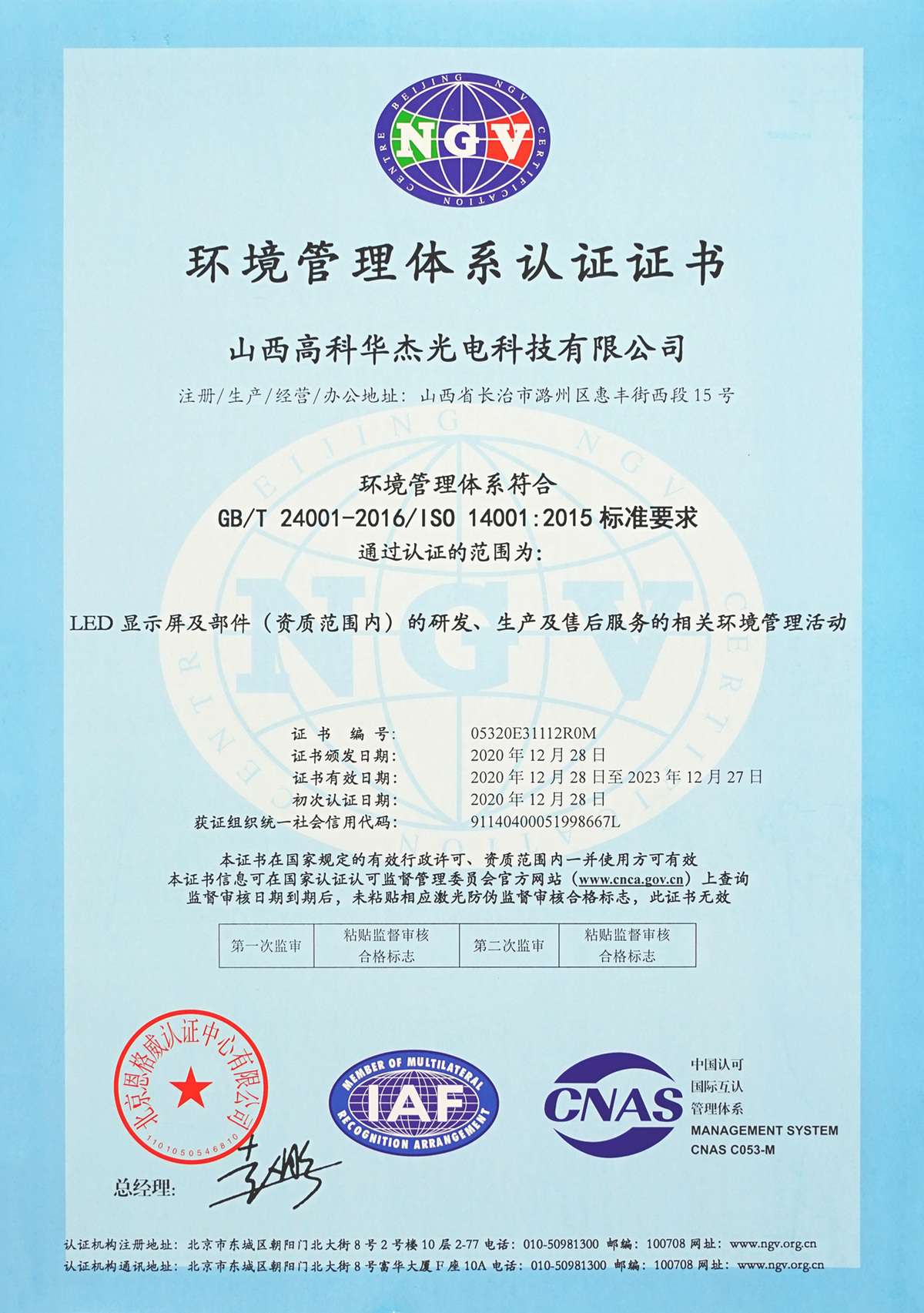 环境管理体系认证证书