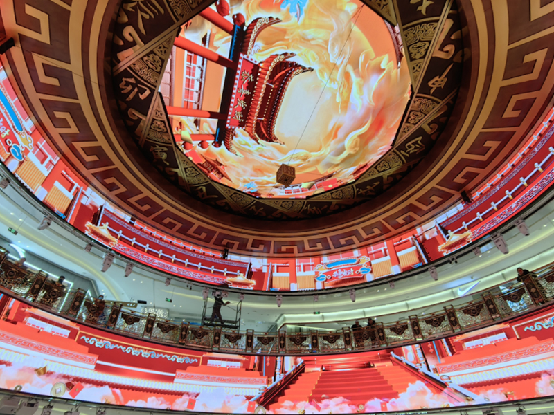 这块屏不是挂在一面墙上,而是覆盖了中庭的天花板和四周的墙面交界处,形成了一种环绕式的视觉布局。站在中庭,抬头是屏,四周也是屏,整个空间都被画面包裹。400㎡的面积加上这种布局方式,让中庭从一个“路过”的空间变成了一个“停留”的空间。