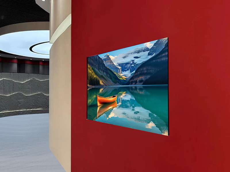 5.32㎡的面积,在这个展厅里刚好。屏幕嵌在墙面,正对着参观者的动线。P1.8是小间距系列,像素密度高,适合近距离观看。展厅空间不大,参观者站在屏前一米多的位置,画面里的文字、图表都清晰锐利。