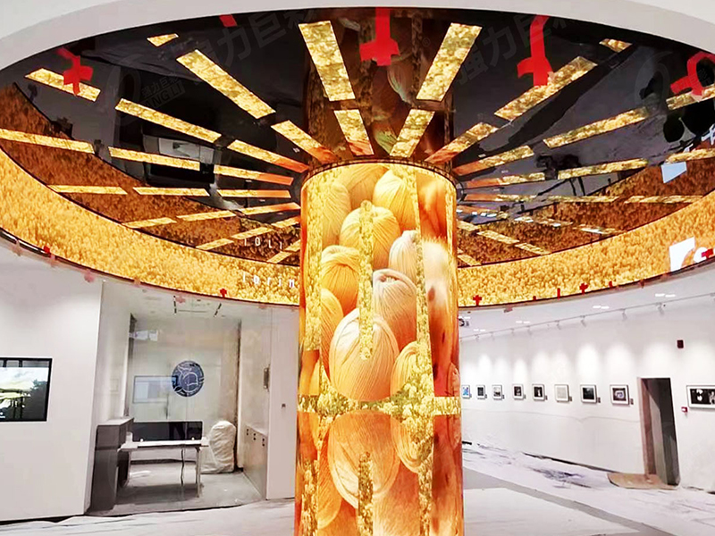 圆柱屏立在展馆的动线交汇处,直径约两米,屏幕包住整个圆柱面,画面从四周都能看到。天幕屏挂在展馆中庭上方,顺着天花板的弧度展开,抬头就是画面。P2柔性屏的特性在这里体现得很充分——普通屏做不了圆柱,也做不了带弧度的天幕,柔性屏可以弯曲,顺着建筑结构走,画面连贯,没有拼接缝。