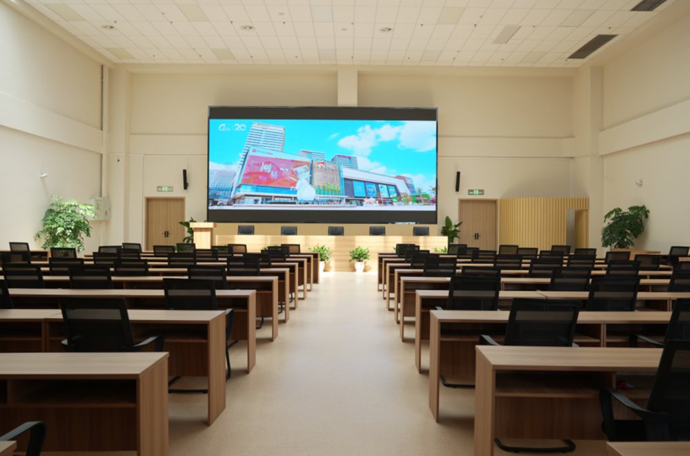 50㎡的面积,在这间会议室里比较协调。会议室能坐一百人左右,屏幕挂在正前方,从第一排到最后一排,视线都不偏不倚。以前用投影,开健康讲座时得关灯拉窗帘,讲座气氛一下子就暗下来了,听课的人也容易犯困。现在有了这块屏,灯照开,窗帘照拉不拉都行,画面清清楚楚。