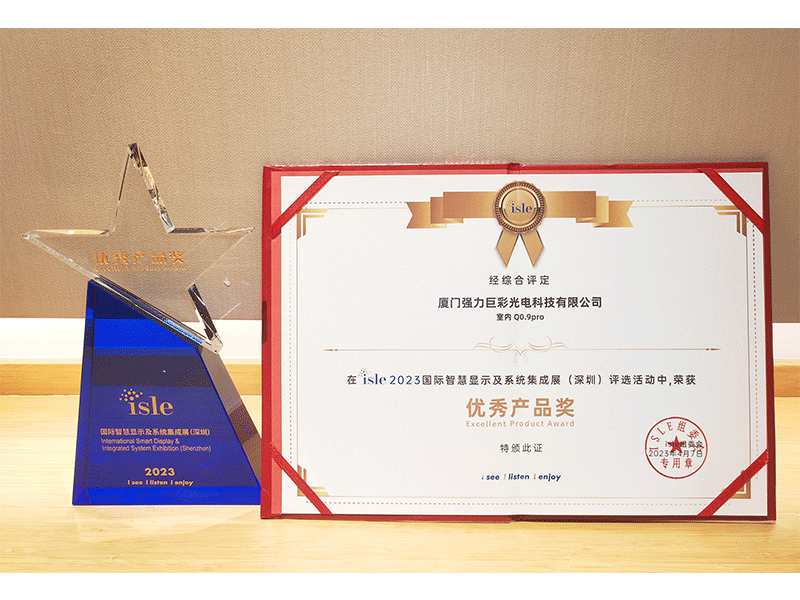 “ISLE优秀产品奖”由ISLE组委会组织专家评审团,从技术创新、产品性能、市场应用等维度对参展产品进行现场打分评选产生,获奖率控制在较低比例。强力巨彩能够在2023年ISLE展上同时斩获“优秀产品奖”与“创新奖”,意味着其Q0.9 Pro超高清小间距、明悦系列透明屏等产品通过了专业评委的现场检验。