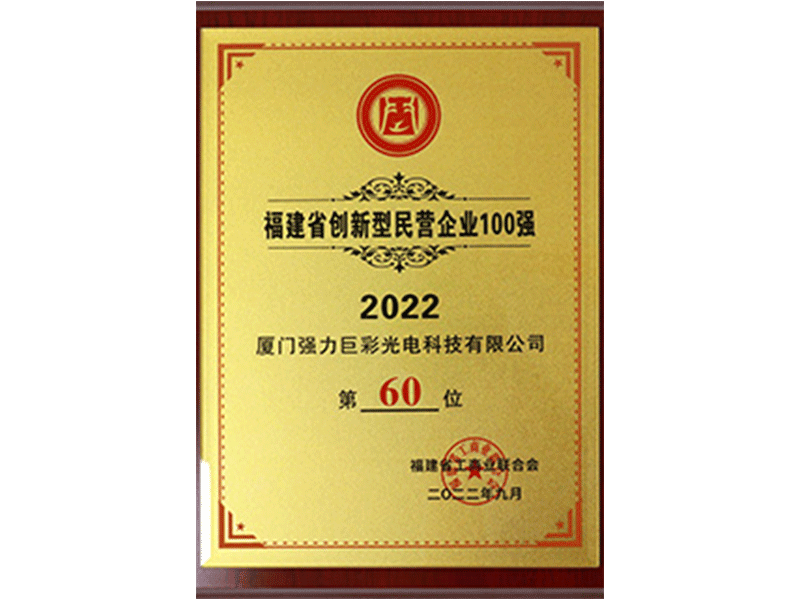 “2022福建省创新型民营企业100强”由福建省工商联发布,评价体系涵盖专利、商标、标准制定、研发主体、新产品销售五大维度。全省100家入选企业中,厦门以62家居首,强力巨彩位列第60位。