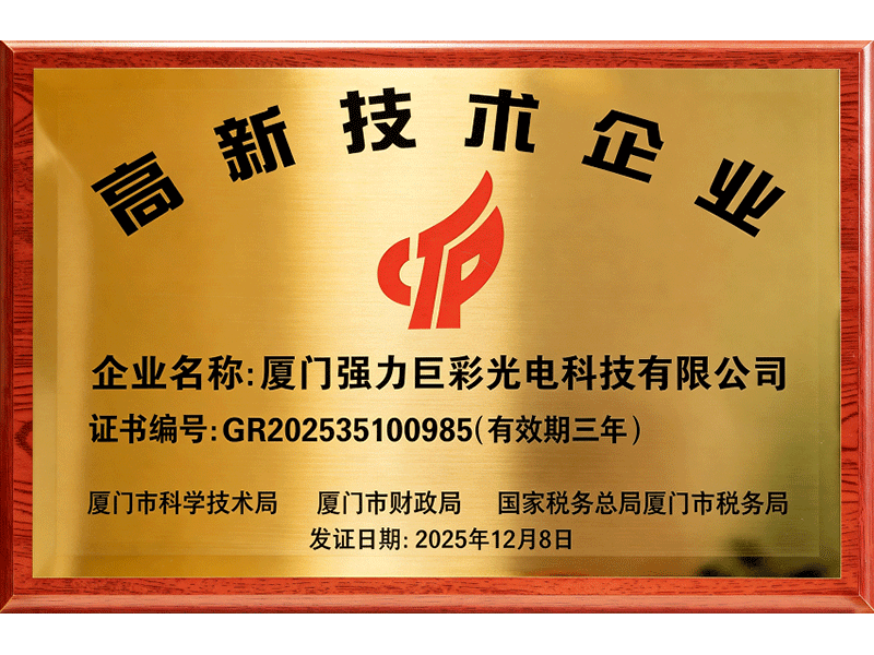 厦门强力巨彩荣获“高新技术企业”认证,该资质由科技部、财政部、税务总局联合认定,是我国科技创新型企业最具权威性的荣誉之一。评选聚焦企业核心自主知识产权、研发投入强度、科技成果转化能力及成长性等核心指标,审核标准严苛。此次获评标志着强力巨彩在LED显示领域的技术研发实力与创新体系获得国家级权威背书,企业不仅享有政策扶持,更代表着在核心技术攻关与产业化应用方面达到行业领先水平,为持续创新注入强劲动力。