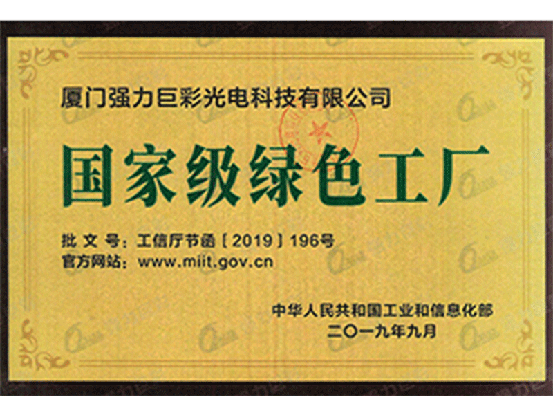 厦门强力巨彩荣获工业和信息化部颁发的“国家级绿色工厂”认证,是国家层面对其在绿色制造、节能减排及可持续发展领域综合实力的权威肯定。该认证评选标准严苛,涵盖基础设施、能源投入、环境排放等多个维度,代表着企业在低碳转型与清洁生产上已达到行业标杆水平。这一荣誉不仅印证了强力巨彩践行绿色发展的硬核实力,更彰显其以环保责任驱动高质量发展的长远格局,为品牌在市场竞争中注入了可持续的信任背书。